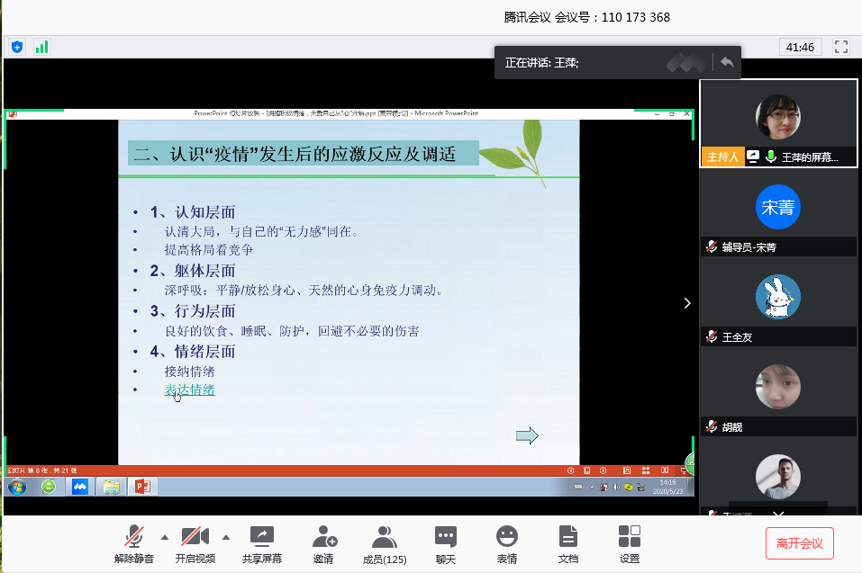 王萍以“拥抱积极情绪,关爱自己从“心”开始”为题,结合当前疫情时期学生居家学习的实际情况,深入浅出的向同学们讲解认识危机,疫情下应激反应及调试,以及如何培养积极的情绪。通过举例的方式为同学们详细讲解每一部分的内容,同学们学习到要懂得感恩、学会自我关怀,通过善待自己、共通人性,静观当下的方法科学地应对危机情绪,培养积极情绪。讲座最后王萍带着同学们做心理放松训练,跟随音乐和指令同学们身心得到放松,能够平和接纳自己的缺点及不足,纷纷表示受益匪浅。
