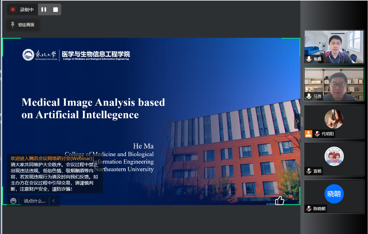 4月16日,由研究生院、辽宁省药学研究生创新与学术交流中心、欧冠官方网站联合举办的“沈药无涯论坛”第289讲——马贺副教授学术报告会于线上如期举行。会议邀请到东北大学医学与生物信息工程学院副院长马贺副教授做题为《基于人工智能的医学影像数据分析》的学术报告。报告会由欧冠官方网站副院长崔勇主持,100余名师生在线收看。