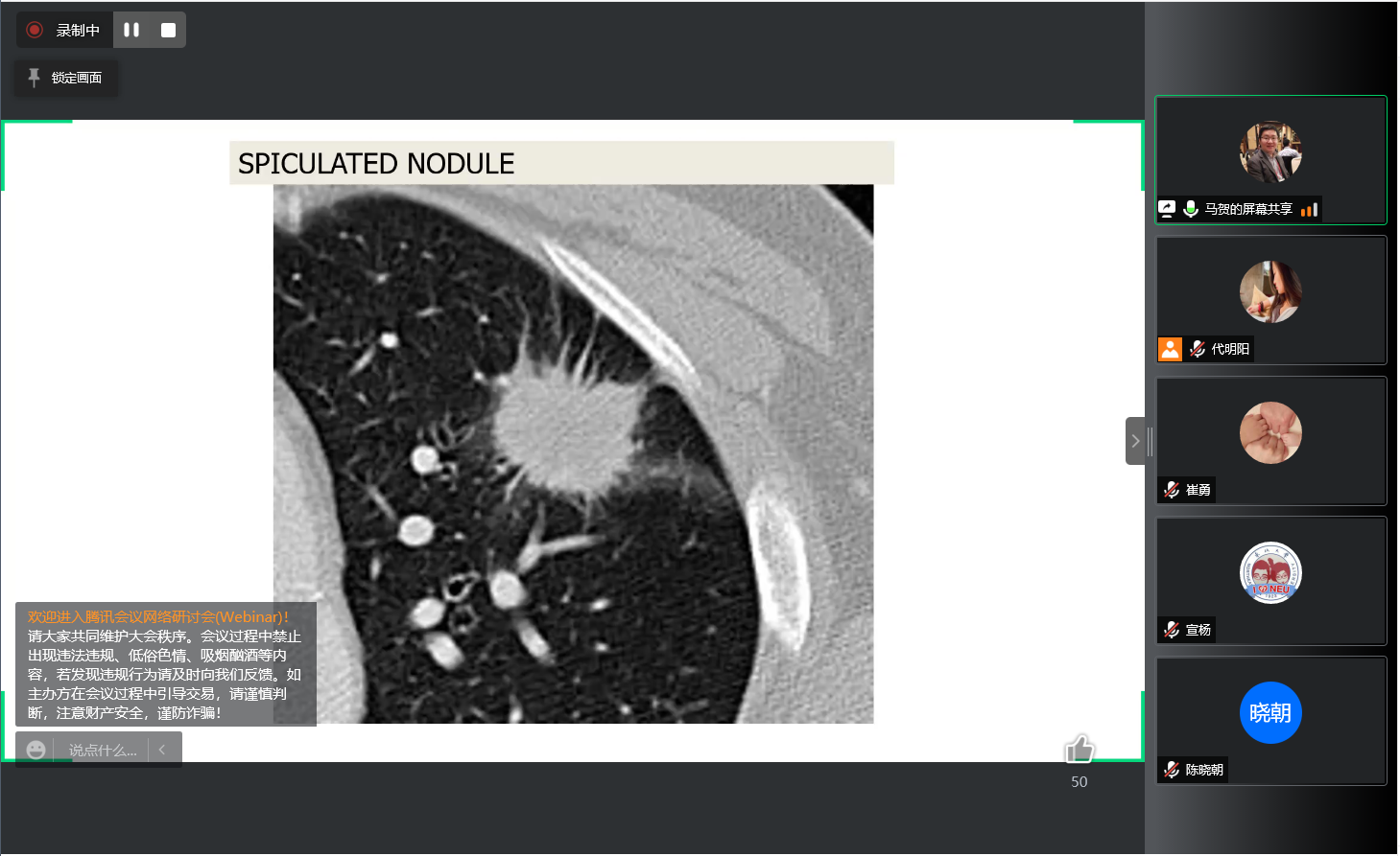 马贺副教授围绕人工智能技术在医学领域的应用,列举包括肝癌、乳腺癌等肿瘤的医学影像病例数据,分析了针对CT、MR、PET、超声等多模态影像数据开展图像分割、图像分类、预后评估、靶区勾画等算法研究,详细讲解了通过构建数据处理网络,通过两阶段3D目标检测网络、五折交叉认证等实验方法,达到辅助提高临床诊断和治疗效能的目的。在报告最后,马贺老师与在线的师生就学术问题进行了充分的交流与讨论,给广大师生提供了可借鉴的研究方法和思路。