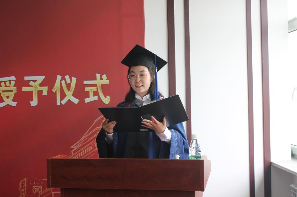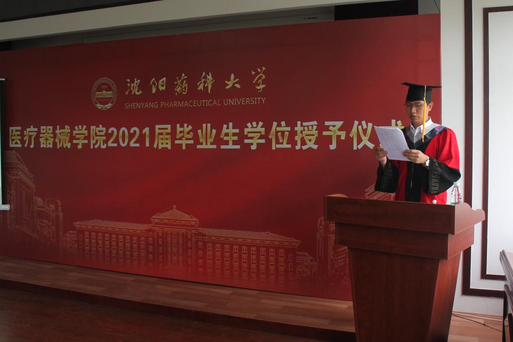 学位授予完成后,2021届研究生李雯雯代表全体毕业研究生发言。她向辛勤培育自己的母校、师长,向支持和关心自己的家人和朋友们表达诚挚的敬意和衷心的感谢,并庄严承诺要将个人所学奉献于社会,把推动祖国药学事业的发展作为自身责任和时代使命,勇做走在时代前列的奋进者、开拓者、奉献者,以执着的信念、优良的品德、丰富的知识、过硬的本领,担负起时代重任,在实现中国梦的伟大征程中大显身手,创造出自己的精彩人生。