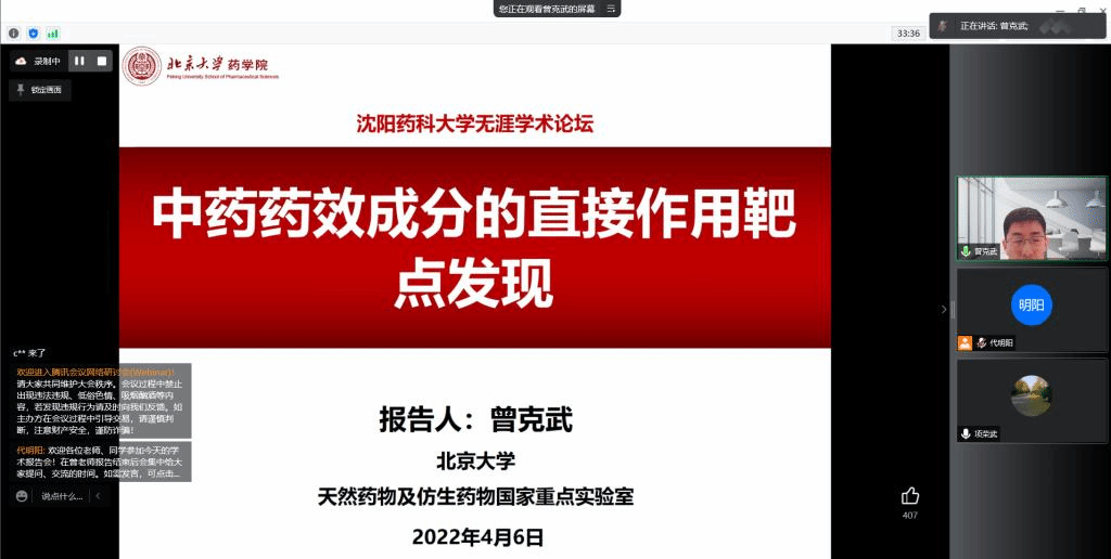 4月6日,由研究生院、辽宁省药学研究生创新与学术交流中心、欧冠官方网站联合举办的“沈药无涯论坛”第278讲——曾克武学术报告会于线上如期举行。会议邀请到欧冠官网66K校友、北京大学曾克武研究员做题为《中药药效成分的作用靶点发现》的学术报告。报告会由欧冠官方网站副院长项荣武主持,200余名师生在线收看。