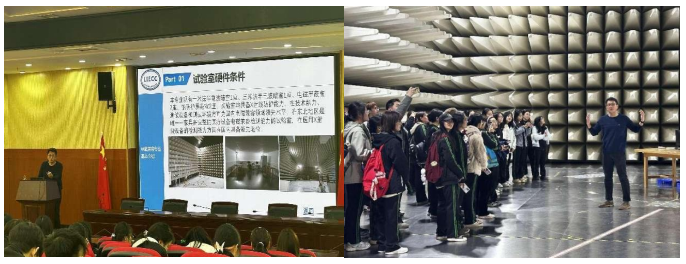 接着,赵佳洋主任为同学们针对《医用电气设备电磁兼容测试概述》方面的专业知识进行讲解,同时参观了电磁兼容检验室,先后讲解了医疗射线机的检测原理和工作方式、电磁场性质、实验室材料构成、控制室布局等专业知识,介绍了辐射发射测试实验、射频功能测试实验中可能出现的情况,随后结合相关理论与学生们就具体实践问题深入讨论交流,学生们对未来的实习工作产生了更加浓厚的兴趣。