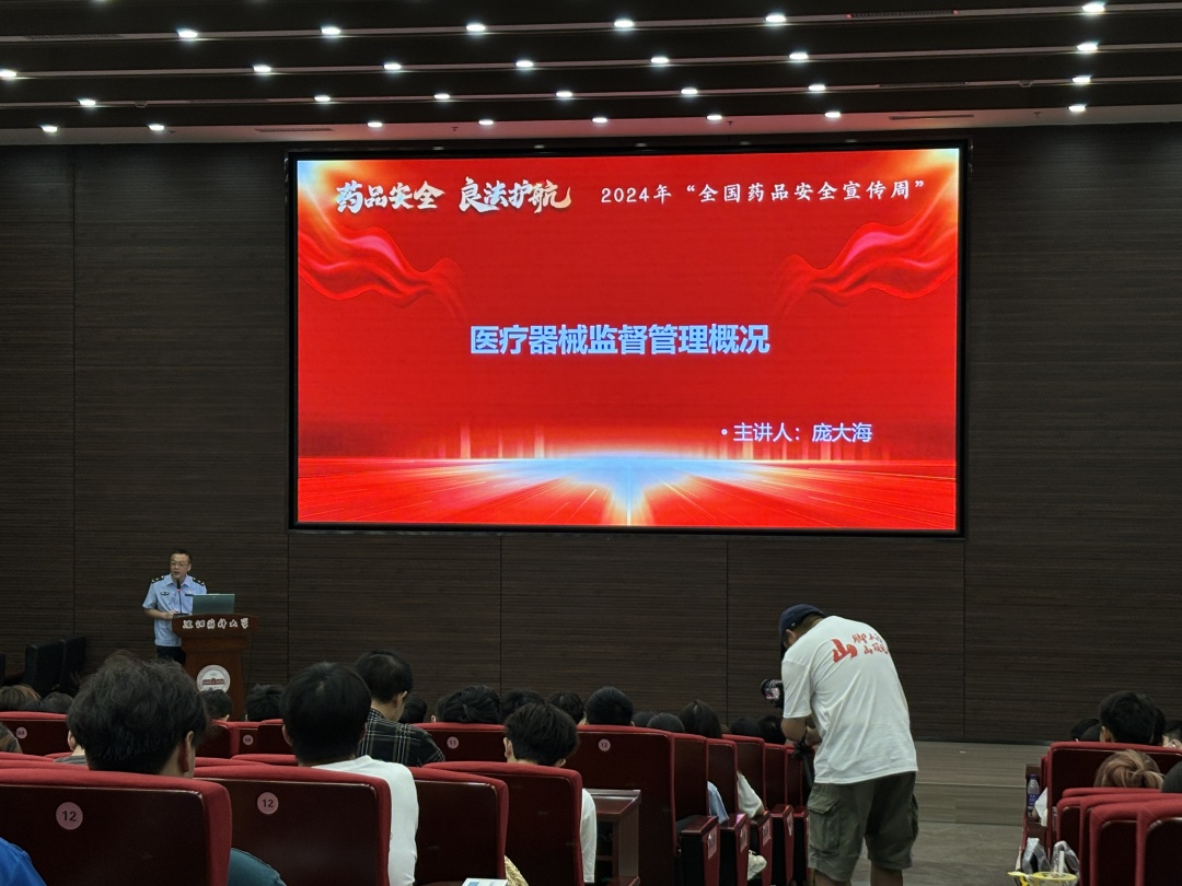 随后,庞大海副处长带来了精彩的医疗器械安全知识讲座。他详细阐述了医疗器械的定义、分类标准、各类器械的特点及应用领域,介绍了医疗器械法规管理概况、目前国内医疗器械监管的构架、组成等知识,为大学生的职业规划提供了有益参考。