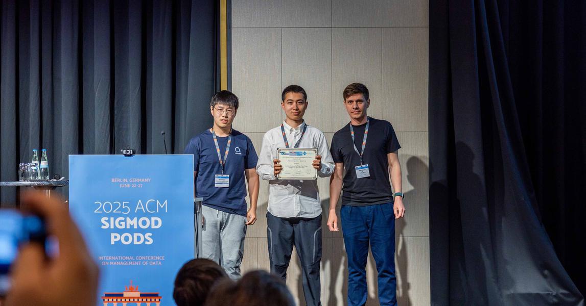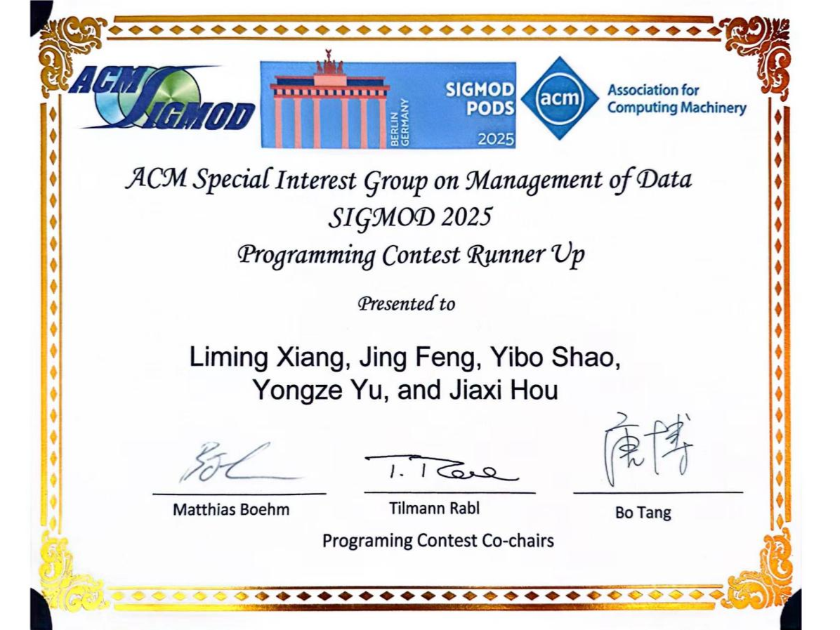 2025年6月,数据库领域全球顶级学术会议SIGMOD 2025在德国柏林落幕。经过激烈角逐,北理工beat365官方网站硕士研究生项黎明、封璟,本科生邵艺博、侯佳希以及来自西安电子科技大学的俞泳泽组成的Kirara队在秦宏超、李荣华、王国仁老师的指导下,获得了编程竞赛全球亚军(Programming Contest Runner Up Award),这是北理工学子首次参加该赛事。本次竞赛冠军由慕尼黑工业大学(TUM)团队夺得,清华大学团队位列第三。