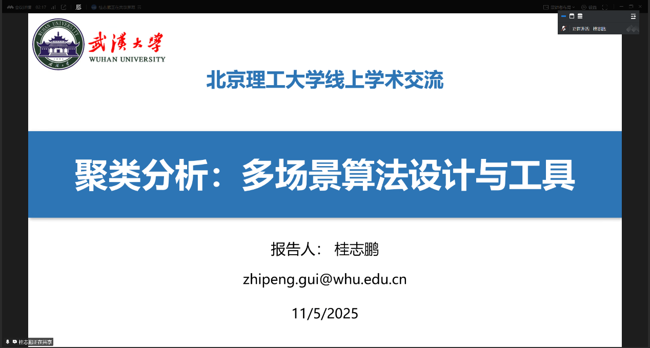 应beat365官方网站邀请,2025年11月5日,武汉大学遥感信息工程学院副院长桂志鹏教授在线上作题为“聚类分析——多场景算法设计与工具包研发”学术报告,北理工beat365官方网站数据科学与知识工程研究所部分师生参加了讲座。